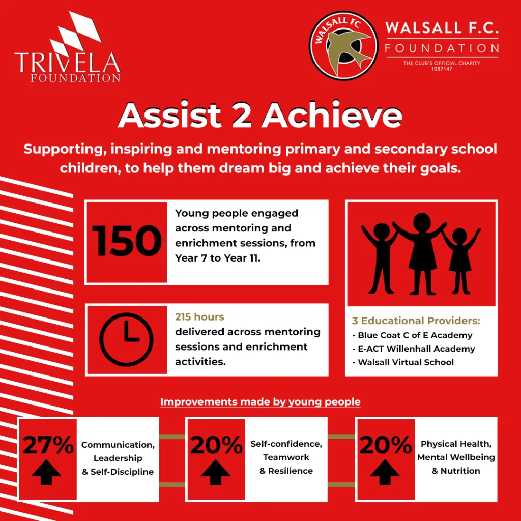 Assist 2 Achieve aims to inspire participants through Walsall FC, using our positive role models, and unique experiences with the football club.