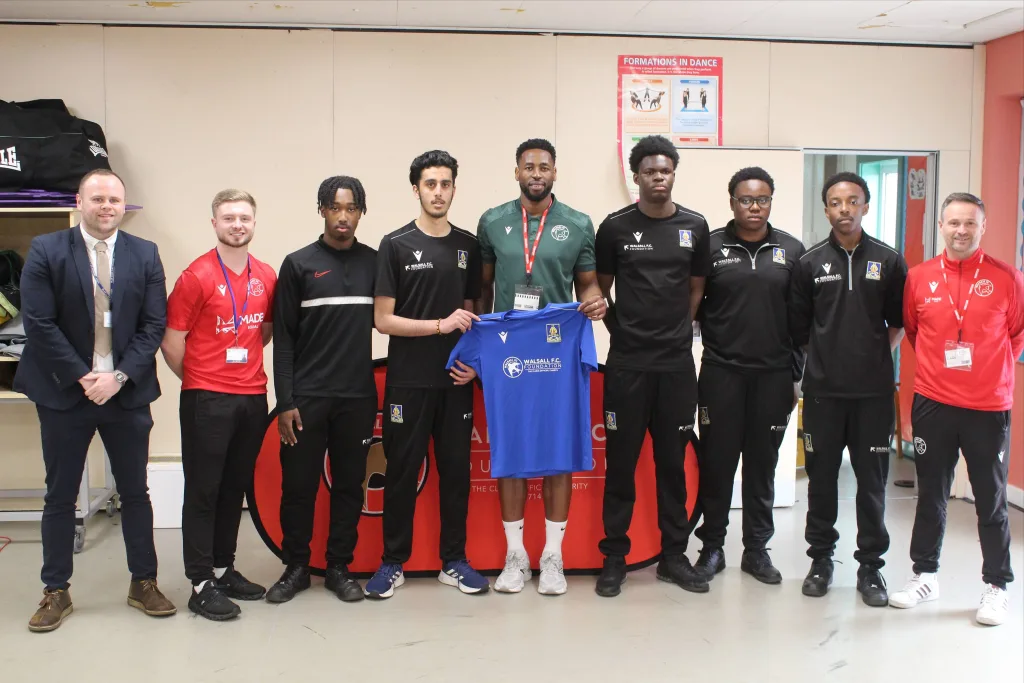 Jamille Matt presented a signed Walsall FC shirt, donated by club sponsors NoFo Brew Co, to Year 8 student Mason during his visit.